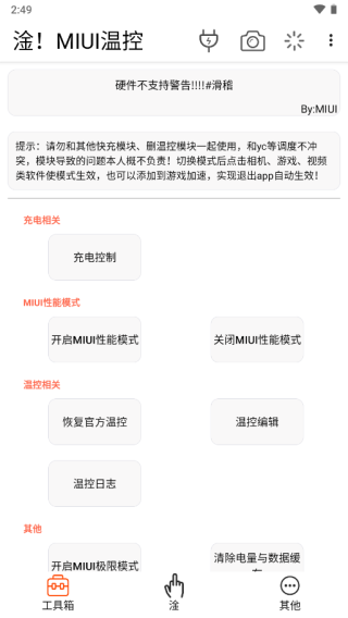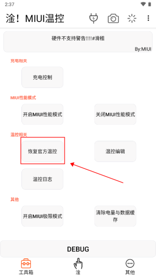 3.点击工具箱可查看其他机型的“淦温控”、充电控制、开启或关闭MIUI性能模式,以及恢复官方温控;