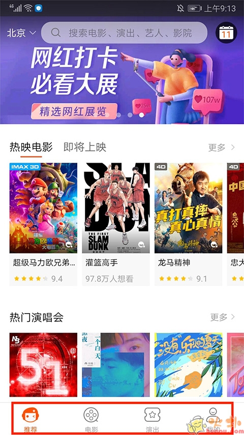 1.打开格瓦拉生活app,进入应用主界面,分为【推荐】、【电影】、【演出】和【我的】栏目,