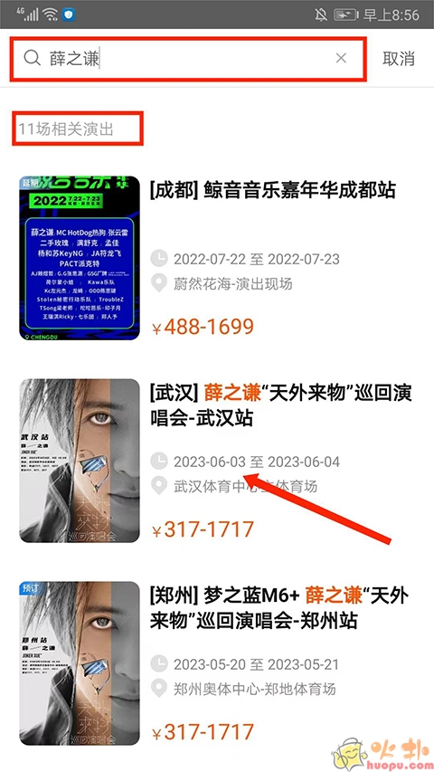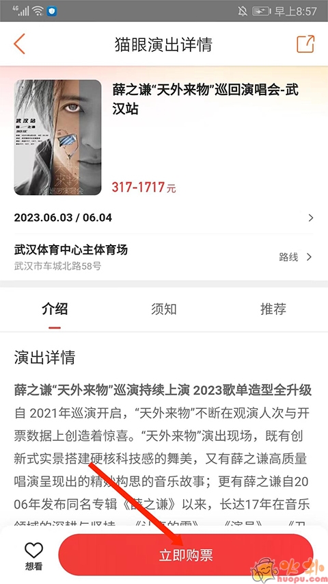 3.如图,可看到薛之谦相关的演出,选择需要观看的演出即可,这里以【武汉站】为例,