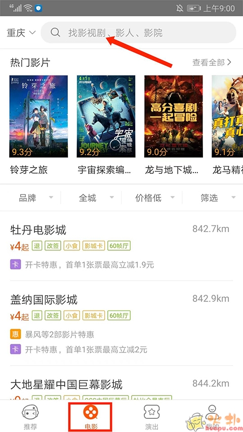 5.进入【电影界面】,可看到热门影片和附近的电影院,在上方【搜索框】可输入影视剧、影人和影院进行查找