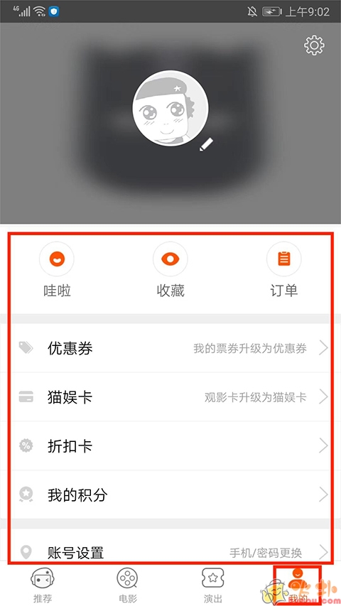7.进入【我的界面】,可看到用户个人信息,包括【影评】、【收藏】、【订单】、【积分】等内容以及进行相关的设置