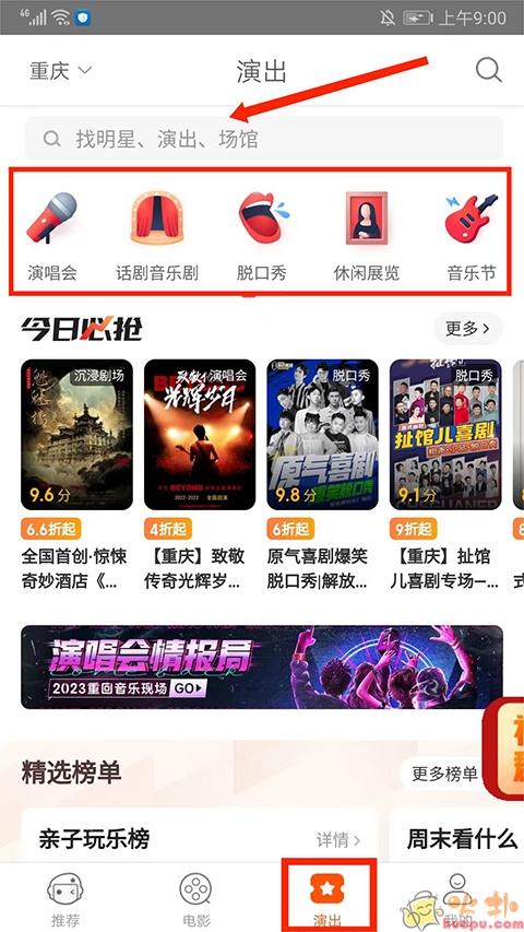 6.进入【演出界面】,包括【演唱会】、【话剧音乐剧】、【脱口秀】、【休闲展览】、【音乐节】等演出类型,也可以在上方【搜索框】查找明星、演出以及场馆,