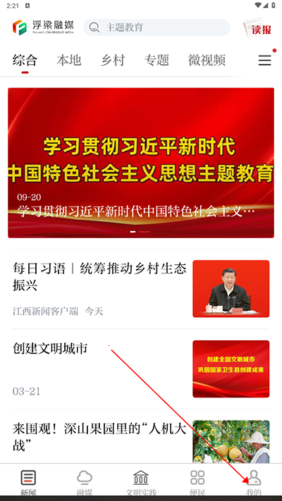 1.下载后打开进入浮梁融媒app,在首页下方点击【我的】;