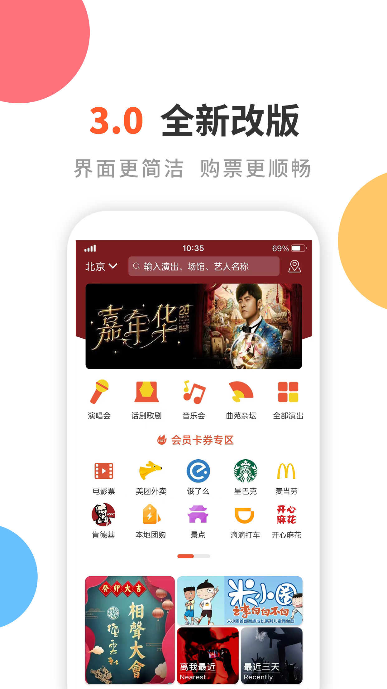 开心麻花话剧,郭德纲德云社相声,钢琴音乐会,久石让音乐会,国家大剧院演出,儿童剧等门票。