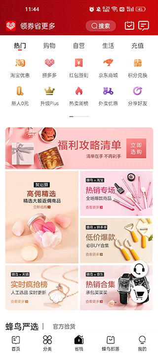 3.点击省钱,在这个页面有许多特价商品以及新人零元福利;