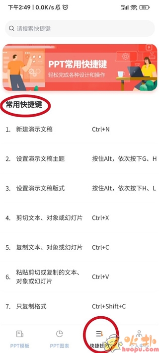 4.选择底部的“快捷技巧”,在这里大家能够学习到常用的制作PPT的快捷键的使用;