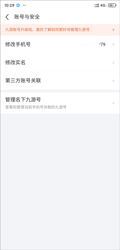 3.进入账号与安全,拥有修改手机号、修改实名、账号关联等功能,点击管理名下九游号,可以查看和管理当前手机号关联的九游号