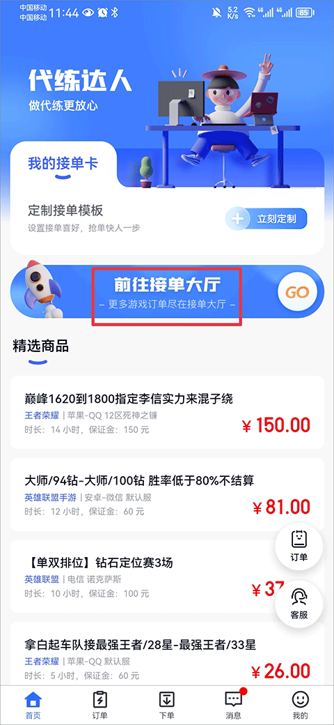 1.打开代练达人app,完成账号登录和实名认证后,在首页中点击前往接单大厅