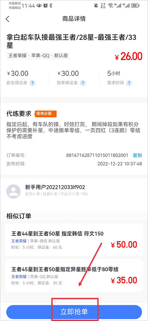 3.选中合适的订单后,在商品详情界面中点击立即抢单即可