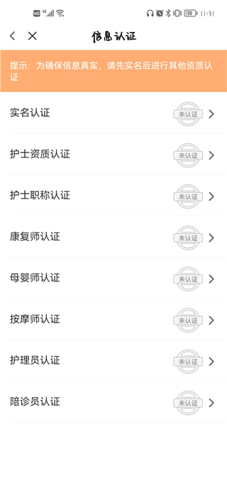 2.不过在接单前你需要在我的页面进行护士资质,护士职称,康复师等认证,认证的资料越多,能接的订单也越多。