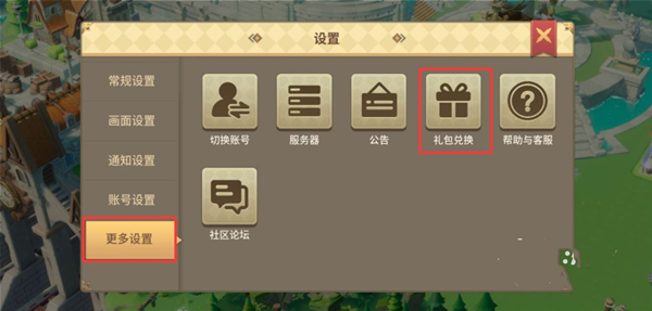 3、第三步:点击设置界面最下方的“更多设置”,然后找到并点击“礼包兑换”。