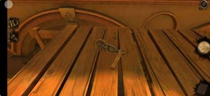 16、回到过去,将轮盘放置在铁门中,对应铁门上的空心圆环将轮盘调好