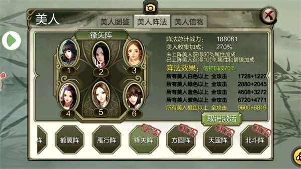 前期阵法没开全时候可以根据职业和需求选择相应的阵法,优先选择上阵美人多的阵法,搭配美人时也应该考虑尽可能多的激活情缘属性。但要注意伤害减免有上限,激活情缘属性时可以优先考虑剩下三条:攻击、防御和生命提高。