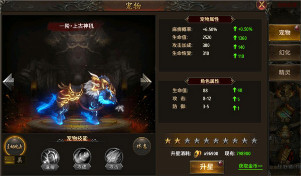 前期激活宠物系统后,优先选择升级宠物,升级宠物只消耗金币,金币获取比较容易。前期宠物在实战中的伤害还是挺高的,可以召唤宠物一起打野怪刷BOSS,快速挑战副本等。