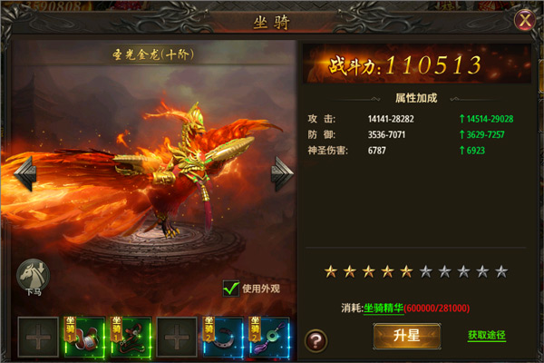 坐骑可以通过消耗坐骑精华提升坐骑星阶,升阶后可大幅度提升战力输出,还能拥有更多的酷炫外形;坐骑精华主要是在神秘商店和钻石商店购买,以及活动获取等。