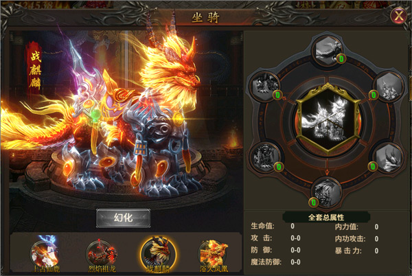 坐骑可以佩戴6件坐骑装备,每件装备都能增加不同的基础属性,并且还能激活套装属性。坐骑可以激活幻化,每个幻化有6个幻化部位,各个部位都可以增加不同属性的属性值。