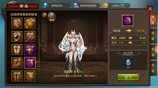 其中核心养成之一是天使系统。天使可以通过激活卡进行激活,激活后可以升级天使或激活大天使之剑。值得一提的是玩家通过战斗可以积攒怒气值,怒气值满后玩家可以化身天使,重现于战场之上。此时外观和技能都有所改变,酷炫的外观和华丽的技能释放更是带来空前的视觉体验。同时,变身后的战力与数值也将得到全面提高,能够轻松秒杀敌人,关键时刻扭转战局,反败为胜。另外,天使变身是具有时效性的,变身时间结束后,玩家将恢复本来的外形和战力。虽然变身维持的时间仅几十秒,但很快又可以积满怒气,在这过程中,即便是平民玩家,也能在瞬间体验到封神绝杀的快感。