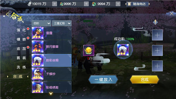 5)四阶(400级)装备开始有幻彩品质,想要合成幻彩装备需要3件同品类红色3星装备作为基础,还需要游戏内顶级道具—幻彩石,该物品只在夺城战和高价值充值活动中产出,幻彩装备乃真·神装