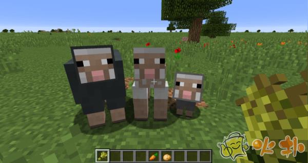 除了吸引羊群之外,小麦还可以用来促进羊的繁殖,羊的繁殖非常有趣——小羊会继承父母的羊毛颜色的一种,但如果父母的羊毛颜色是两种可以互相结合形成新颜色的品种时,小羊则会变成混合色,举例来说,灰色羊与白色羊可能生出浅灰色羊,正如图例。