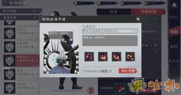 如何申请扮演BOSS呢?在全民扮演BOSS界面选择你最想扮演的BOSS,点击申请即可。在申请过程中需要设置好气泡话对话内容,气泡话的触发需要一定的条件,当BOSS释放技能时、杀死玩家时、血量至一定比例时等等,可以触发不同的气泡话。