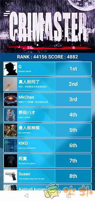 这里可以说是还原了唐人街探里的排行榜,里面的榜一就是我们熟悉的Q,但是据说是官方账号并非真人,具体到底是不是,crimaster官方也没有回应,但是榜二榜三据我的观察应该都是真实玩家,而其他的玩家ID,像唐人街侦探,阿默(林默?)等等唐人街探案宇宙中的知名侦探,是真人还是官方账号也没人知道。但是在这里你却可以看到自己的排位。PS:由于玩家数量的增加,刷分的玩家也有不少,所以排位会很不稳定(中下游分数,大概5000分以后的玩家),所以想要拿到靠前的榜位还是有点难的,特别是针对新手。