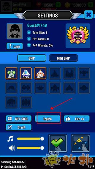 首次进入游戏后,先简单的过一下游戏的教程,然后回到主界面中点击左上方的“头像”,然后点击“English”如下图所示箭头指向位置处。