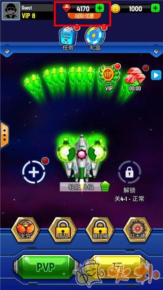 3、点开飞船界面,可以强化飞船,装配不同的装备,通过奖励和购买提升武器,更轻松消灭怪物