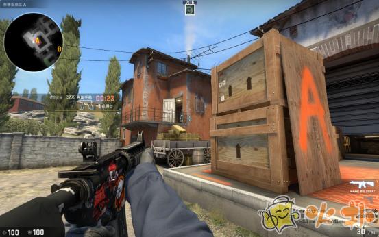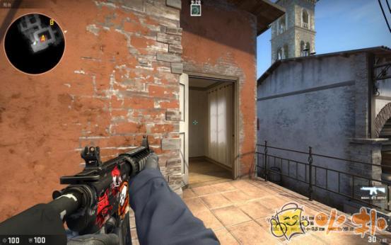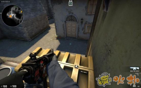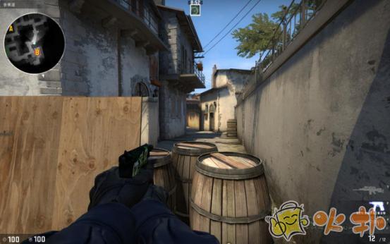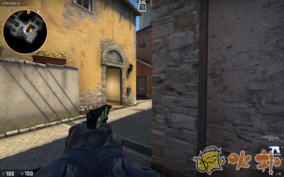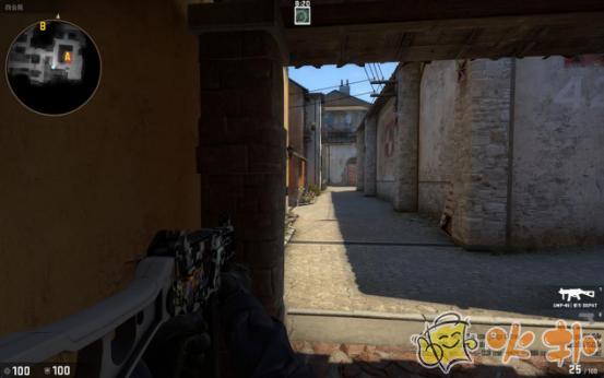当T进攻B点断后的时候,站这里比贴墙好的原因是因为地图的改动,香蕉道门口两边都可以站人,此时如果对手稍有头脑就会先看右边(图中准星瞄准的地方)再来检查左边,此时你完全可以提前半个身位知道他的动向。