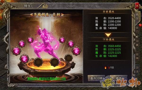 转生可增加角色攻击、防御、魔防、生命值等基础属性,在碰到无法碾压的怪物时,记得来升级下转生系统喔!转生升级需要消耗元宝或灵符,购买相应的材料即可享受加速升级。